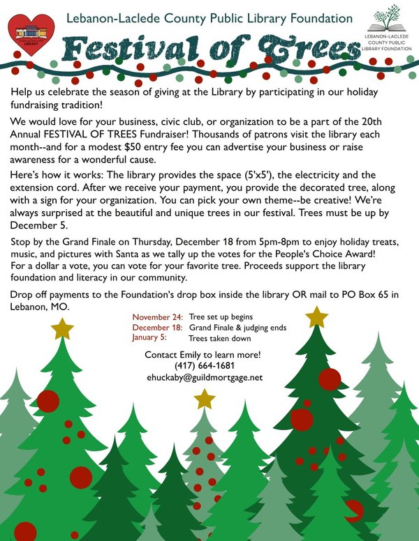 2025 marks the 🎄20th Annual Festival of Trees Fundraiser🎄 with the Lebanon-Laclede Public Library Foundation!